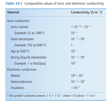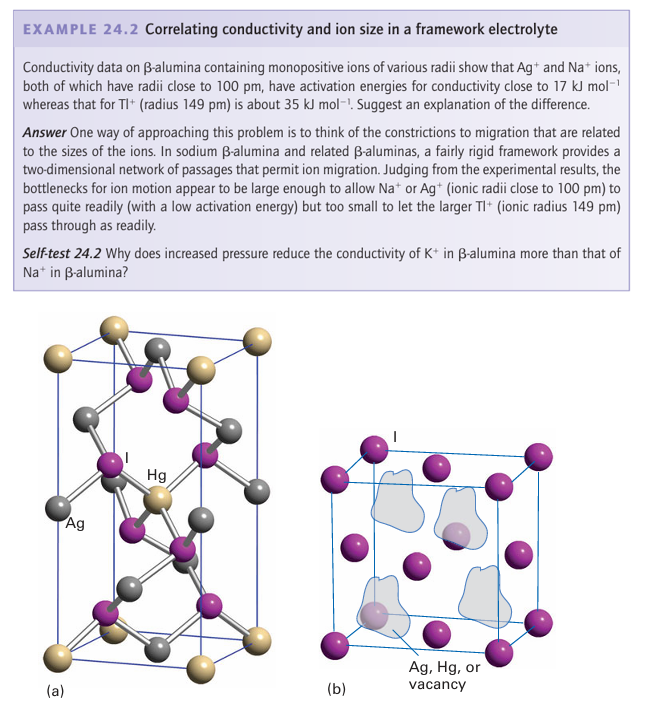 Below 50°C, Ag2 HgI4 has an ordered crystal structure in which Ag and Hg ions are tetrahedrally coordinated by I ions and there are unoccupied tetrahedral holes (Fig. 24.5a). At this temperature its ionic conductivity is low. Above 50°C, however, the Ag+ and Hg+2 ions are randomly distributed over the tetrahedral sites (Fig. 24.5b) and as a result there are many more sites that Ag+ ions can occupy within the structure than there are Ag ions present. At this temperature the material is a good ionic conductor, largely on account of the mobility of the Ag ions between the different sites available for it. The close-packed array of polarizable I- ions is easily deformed and results in a low activation energy for the migration of an Ag ion from one ion site to the next. There are many related solid electrolytes having similar structures containing soft anions, such as AgI and RbAg4I5, both of which have highly mobile Ag+ ions so that the conductivity of RbAg4I5 at room temperature is greater than that of aqueous sodium chloride.