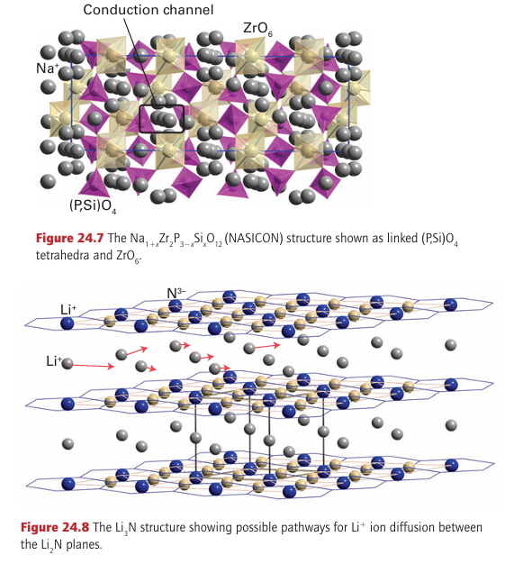 Sodium-alumina is an example of a mechanically hard material that is a good ionic conductor. In this case, the rigid and dense Al2O3 slabs are bridged by a sparse array of O2- ions (Fig. 24.6). The plane containing these bridging ions also contains Na ions, which can move from site to site because there are no major bottlenecks to hinder their motion. Many similar rigid materials having planes or channels through which ions can move are known; they are called framework electrolytes. Another closely related material, sodium -alumina, has even less restricted motion of ions than -alumina, and it has been found possible to substitute doubly charged cations such as Mg+2 or Ni+2 for Na+. Even the large lanthanoid cation Eu2 can be introduced into -alumina, although the diffusion of such ions is slower than that of their smaller counterparts. The material NASICON, mentioned earlier, is a nonstoichiometric, solid-solution system with a framework constructed from ZrO6 octahedra and PO4 tetrahedra, corresponding to the parent phase of composition NaZr2P3O12 (Fig. 24.7). A solid solution can be obtained by partially replacing P by Si to give Na1+x Zr2P3-x SixO12 with an increase in the number of Na ions for charge balance. In this material, the full set of possible Na sites is only partially filled and these sites lie with in a three-dimensional network of channels that allow rapid migration of the remaining Na ions. Other classes of materials currently being investigated as fast cation conductors include Li4GeO4 doped with V on the Ge sites (Li4 x (Ge1-x Vx) O4, a lithium-ion conductor with vacancies on the Li ion sub-lattice), the perovskite La0.6 Li0.2TiO3, and sodium yttrium silicate, Na5YSi4O12 (a sodium-ion conductor).