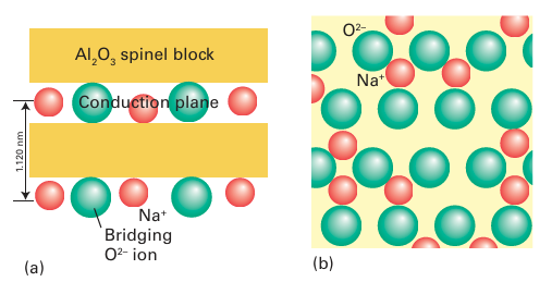Figure 24.6 (a) Schematic side view of -alumina showing the Na2O conduction planes between Al2O3 slabs. The O atoms in these planes bridge the two slabs. (b) A view of the conduction plane. Note the abundance of mobile ions and vacancies in which they can move.
