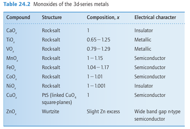 In fact, the actual stoichiometries formed around the ideal composition MO and the structures and properties of these oxides are more interesting, and as a result they have been re-peatedly investigated (Table 24.2). In particular, the compounds provide examples of how mixed oxidation states and defects lead to nonstoichiometry for solids that are nominally TiO, VO, FeO, CoO, and NiO. All these compounds are usually obtained with significant deviations from the nominal MO stoichiometry.