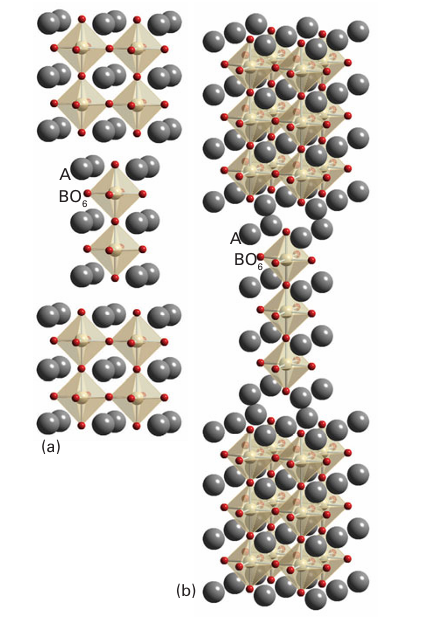 Figure 24.22 The Ruddlesden–Popper phases of stoichiometry (a) A3 B2O7 and (b) A4B3O10 formed respectively from two and three perovskite layers of linked BO6 octahedra separated by A-type cations.