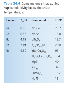 Key point: High-temperature cuprate superconductors have structures related to perovskite. The versatility of the perovskites extends to superconductivity because most of the high temperature superconductors (which were first reported in 1986) can be viewed as variants of the perovskite structure. Superconductors have two striking characteristics. Below a critical temperature, Tc (not to be confused with the Curie temperature of a ferroelectric, TC), they enter the superconducting state and have zero electrical resistance. In this super conducting state they also exhibit the Meissner effect, the exclusion of a magnetic field. The Meissner effect is the basis of the common demonstration of superconductivity in which a pellet of superconductor levitates above a magnet. It is also the basis for a number of potential applications of superconductors that include magnetic levitation, as in MAGLEV trains. Following the discovery in 1911 that mercury is a superconductor below 4.2 K, physicists and chemists made slow but steady progress in the discovery of superconductors with higher values of Tc at a rate of about 3 K per decade. After 75 years, Tc had been edged up to 23 K in Nb3Ge. Most of these superconducting materials were metal alloys, although superconductivity had been found in many oxides and sulfides (Table 24.4); magnesium diboride is superconducting below 39 K (see Box 13.4). Then, in 1986, the