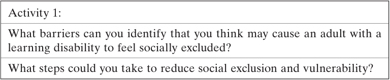 The reality for many adults with learning disabilities is a life with limited choice, rights, independence or inclusion – the four key principles at the heart of Valuing People (Department of Health 2001b). This state of affairs puts many adults with learning disabilities in a vulnerable position, as they are dependent on family, carers and professionals to help them live their lives. This can lead to potential vulnerability, as an adult with a learning disability is reliant on the honesty, integrity and professionalism of those caring for him/her. Alongside this is the difficulty that adults with learning disabilities may have in making their needs and wishes known, and in being heard, listened to and understood by families, carers and professionals (Department of Health 2001b):