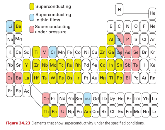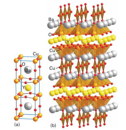 Key point: High-temperature cuprate superconductors have structures related to perovskite. The versatility of the perovskites extends to superconductivity because most of the high temperature superconductors (which were first reported in 1986) can be viewed as variants of the perovskite structure. Superconductors have two striking characteristics. Below a critical temperature, Tc (not to be confused with the Curie temperature of a ferroelectric, TC), they enter the superconducting state and have zero electrical resistance. In this super conducting state they also exhibit the Meissner effect, the exclusion of a magnetic field. The Meissner effect is the basis of the common demonstration of superconductivity in which a pellet of superconductor levitates above a magnet. It is also the basis for a number of potential applications of superconductors that include magnetic levitation, as in MAGLEV trains. Following the discovery in 1911 that mercury is a superconductor below 4.2 K, physicists and chemists made slow but steady progress in the discovery of superconductors with higher values of Tc at a rate of about 3 K per decade. After 75 years, Tc had been edged up to 23 K in Nb3Ge. Most of these superconducting materials were metal alloys, although superconductivity had been found in many oxides and sulfides (Table 24.4); magnesium diboride is superconducting below 39 K (see Box 13.4). Then, in 1986, the