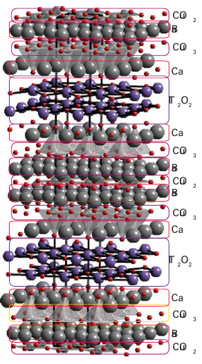 Figure 24.25 Tl2 Ba3Ca2Cu3O10 structure formed from three oxygen-deficient perovskite layers produced from linked CuO4 square planes and square-based pyramids separated by Ca on the A type cation position. Double layers of stoichiometry Tl2O2 with rock-salt type arrangements of the Tl and O atoms are interleaved between the multiple perovskite layers.