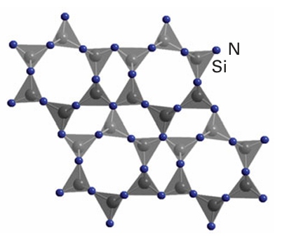 Figure 24.35 The structure of Si3N4 shown as linked SiN4 tetahedra. conditions, and are used for crucibles and furnace elements. Recently, GaN, which can exist in both wurtzite and sphalerite structural types, has been the focus of considerable research on account of its semiconducting properties. The nitride Li3N has an unusual structure based on hexagonal Li2N layers separated by Li ions (Fig. 24.8). These Lions are highly mobile, as is expected from the existence of free space between the layers, and this compound and other structurally related materials are being studied for possible use in rechargeable batteries. Among the many complex nitrides that have been synthesized are materials of stoichiometry AMN2, such as SrZrN2 and CaTaN2, with structures based on sheets formed from MN6 octahedra sharing edges (see the discussion of LiCoO2 in Section 24.7h) and A2MN3, such as Ba2VN3, containing one-dimensional chains of corner sharing MN4 tetrahedra (Fig. 24.36). Analogues of the zeolites containing nitride bridges rather than oxide bridges have also been prepared.