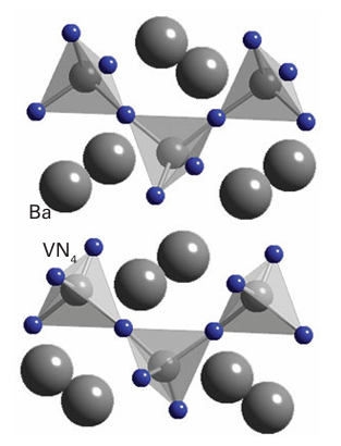 Figure 24.36 Ba2VN3, containing one dimensional chains of corner-sharing VN4 tetrahedra separated by Ba+2 ions.