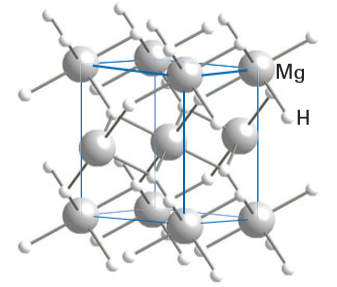 Magnesium hydride, MgH2 (rutile structure type, Fig. 24.59) potentially offers a high capacity of 7.7 per cent hydrogen by mass combined with the low cost of magnesium and good reversibility for hydrogen uptake and evolution at high temperatures. However, its decomposition temperature of 300°C under 1 atm of hydrogen gas is uneconomically high and considerable effort has been expended to develop new related materials that have lower hydrogen release temperatures. Doping of MgH2 with a variety of metals has been undertaken to produce the solid solutions Mg1-xMxH2±y for M = Al, V, Ni, Co, Ti, Ge, and La/Ni mixtures, some of which have slightly lower decomposition temperatures. More promising are changes in the microstructure of MgH2 which are caused by ball-milling (where the solid is shaken vigorously with small hard spheres inside a canister), particularly when done in combination with other materials, such as metal (Ni, Pd) and metal oxides (V2O5, Cr2O3). Ball-milling of MgH2 increases the surface area of the solid by about a factor of 10 and the number of defects in the crystallites, promoting both the adsorption and deadsorption of hydrogen.