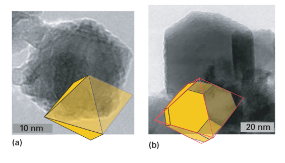Figure 25.6 TEM images of nanoparticles of Ni0.5Zn0.5Fe2O4 synthesized by plasma torch synthesis. The particle shapes are superimposed: (a) an octahedron and (b) a truncated octahedron. (Based on images provided by M. McHenry and R. Swaminatham.)
