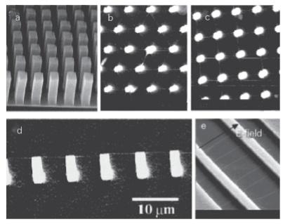 Figure 25.18 Ordered carbon nanotube structures obtained by direct chemical vapour deposition synthesis. (a) An SEM image of self-oriented MWNT arrays. Each tower-like structure is formed by many closely packed multiwalled nanotubes. Nanotubes in each tower are oriented perpendicular to the substrate. (b) SEM top view of a hexagonal network of SWNTs (the line-like structures) suspended on top of silicon posts (the bright dots). (c) SEM top view of a square network of suspended SWNTs. (d) Side view of a suspended SWNT power line on silicon posts (the bright lines). (e) SWNTs suspended by silicon structures (the bright regions). The nanotubes are aligned along the electric field direction. (H. Dai, Acc. Chem. Res., 2002, 35, 1035.) (Reproduced with permission from the American Chemical Society.) The repeating axial hexagonal patterns of CNTs are graphitic structures; however, the electrical properties of nanotubes depend on the relative orientation of the repeating hexagons. The nanotubes can be either semiconductors or metallic conductors. When oriented in the chair configuration, CNTs exhibit remarkably high electrical conductivity. Electrons can travel through the micrometre-length nanowire with zero scattering and zero heat dissipation. CNTs also have very high thermal conductivity, comparable to the best thermal conductors known (such as their counterparts, diamond and graphite). Therefore, they are being heralded as the ideal nanomaterial for the development of interconnects for integrated circuits. They may solve two key challenges in the computer industry: heat dissipation and increased processing speeds. Open-ended CNTs can also be used for nanorobotic spot welding to deposit metal at specific sites for connections in integrated circuits (Fig. 25.19). Copper is a good choice for these applications because it has high thermal and electrical conductivity. It also has a very low bonding energy to C (0.10–0.14 eV/atom), so can be deposited easily on surfaces and structures from the encapsulating CNT. The deposition is accomplished by making physical contact between a STM probe and a copper-filled CNT tip, and then applying a potential difference to create a circuit with the probe as the anode. This procedure generates sufficient heat for the Cu atoms to be able to migrate along the tube and be deposited where they are required. The nanowelding process is of interest because its advantages include efficiency (a very low current can induce melting and flow), three-dimensional manipulation of welding site by using piezoelectric distortion, rapid melting, precise control of small mass delivery, and the compatibility of Cu with conventional semiconductors. In addition to CNTs, parallel methods have been discovered for making nanotubes out of materials that share bonding characteristics with C, including semiconductors and metal oxides. More specifically, BN, ZnO, ZnSe, ZnS, InP, GaAs, InAs, and GaN have all been made into nanotubes. The novel electronic properties and small sizes of these nanotubes make them appealing as inorganic nanowires. Core–sheath wires similar to macroscopic coaxial wires are of great interest. One method to prepare them uses a colloid-templating strategy that involves a layer-by-layer assembly of polyelectrolytes and inorganic nanoparticles on submicrometre- and micrometre-sized polystyrene (PS) latex particles. A number of methods, including laser ablation, carbothermal reduction, and several solution-based methods, have been developed to generate one-dimensional nanostructures with coaxial structures. For instance, by using a novel nanowire-templating technique based on the layer-by-layer approach and calcining (heating in air to drive off volatile templating agents), ordered Au/TiO2 core–sheath nanowire arrays have been fabricated. A template-grown gold nanowire array is used as a positive template, and then a cationic polyelectrolyte and an inorganic precursor are assembled on gold nanowires by the layer-by-layer technique. Calcination then converts the inorganic precursor to titanium dioxide (Fig. 25.20).