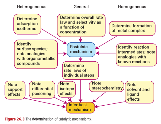 are proposed, then isotopic tracer studies may serve as a test. The influences of different ligands and different substrates are also sometimes informative. Although rate data and the corresponding laws have been determined for many overall catalytic cycles, it is also necessary to determine rate laws for the individual steps in order to have reasonable confidence in the mechanism. However, because of experimental complications, it is rare that catalytic cycles are studied in this detail.