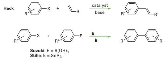 A large number of palladium-catalysed carbon-carbon bond-forming (‘coupling’) reactions are known. They include the coupling of a Grignard with an aryl halide and the Heck, Stille, and Suzuki coupling reactions: