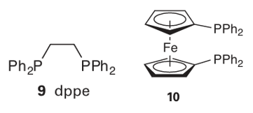 addition of an aryl–halogen bond to an unsaturated Pd(0) complex (A) results in a Pd(II) species (B). Coordination of an alkene results in complex (C); 1,2-insertion results in an alkyl complex (D), which can be deprotonated with the loss of the halide to give the org anic product attached to the palladium atom (E). In other palladium-catalysed coupling reactions, such as that of a Grignard reagent with an aryl halide, initial oxidative addition proceeds as in Fig. 26.11. The second organic group is thought to be introduced with the Grignard reagent behaving as the nucleophilic R group displacing the halide at the metal centre in (B), to give two organic fragments attached to the Pd atom, as indicated in Fig. 26.12. These two adjacent fragments can then couple and reductively eliminate to regenerate the starting Pd (0) species (A). In all palladium-catalysed coupling reactions, it is necessary for the two fragments that are coupling to be cis to each other at the metal centre before insertion or reductive elimination can take place; this requirement has led to the use of chelating diphosphines such as dppe (9) and the ferrocene derivative (10). Palladium-catalysed coupling reactions are tolerant to a wide range of substitution on both fragments and, with suitable substrates and appropriate chiral ligands, asymmetric reactions are possible too. The reaction