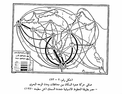 4- نقوم بعد ذلك بتمثيل قيم صافى الهجرة بخطوط انسيابية بين محافظة القاهرة والمحافظة الأخرى مع رسم رأس سهم نحو القاهرة لكل خط انسيابي يمتد من المحافظة التي تكسب منها القاهرة عدداً من السكان كمهاجرين إليها.