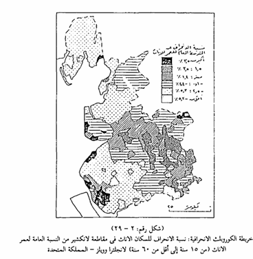 تستخدم النسب المئوية للأشخاص فى كل فئة من فئات السن كأساس لرسم خريطة الكوروبلث لتبين التوزيع التفصيلي للسكان حسب فئات منهم وتتمثل أهمية هذه الخريطة في أنه يمكن منها التعرف على الحالات الشاذة بين فئات السن ، كما يمكن أن يستدل ذلك بتوقيع الانحرافات الاقليمية بالنسبة للمتوسط القومي العام، وذلك على هيئة فرق موجب أو سالب بين النسب المئوية لفئات السن فى الوحدة الإدارية والنسب المئوية لفئات السن على مستوى الدولة ملها، فعلى سبيل المثال إذا أردنا التعرف على التباين الاقليمي للتركيب العمري لسكان إحدى المحافظات في سن العمل أي من فئات السن التي تبدأ من 15 سنة إلى السن أقل من 60 سنة فإننا يجب أن نجمع عدد السكان لفئات السن المذكورة للسكان في كل مركز إداري، ثم تحسب النسبة المئوية لهم من المجموع الكلى للسكان فى المركز الإداري وبعد ذلك نحسب النسبة المئوية لهم من المجموع الكلي للسكان في المركز الإداري وبعد ذلك نحسب النسبة المئوية لهذه الفئات العمرية على مستوى الدولة كلها ، ثم نحسب الفرق سواء كان هذا الفرق اشارته موجبة أو سالبة بين نسبة كل مركز إدارى والنسبة العامة للدولة، ونقوم بتوقيع الفروق على الخريطة ولتكن بالتظليل بالخطوط المختلفة في شكلها ومجموعة من فئات التظليل بالنقط للفروق السالبة والشكل رقم (29) يوضح مثالا لبيان مثل هذا النوع من الخرائط التي تستخدم طريقة الكوروبلث لتوضيح الظاهرة المراد دراستها. ومما تجدر الإشارة إليه أنه كلما كانت الوحدات الإدارية المستخدمة صغيرة كلما كانت النتائج المستخلصة من الخريطة ذات أهمية كبيرة لمجالات التخطيط الاقتصادي والاجتماعي.