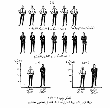 وتتفق طريقة الرسوم التصويرية مع أسلوب الأعمدة البيانية البسيطة، فبدلا من رسم عامود لكل ظاهرة بطول يتفق مع الكمية المراد تمثيلها، ترسم صورة أو شكل يدل على نوع الظاهرة بمجرد النظر إليه، وفي هذه الحالة يمكن وضع المحور الرأسي ليبين قيم الظاهرة، كما في حالة تمثيل السكان برسم أشخاص، أو يمكن حذف المحور الرأسي بعد رسم الصور وإضافة التمييز الكمي للظاهرة وذلك بكتابتها مباشرة على الرسم، كما في حالة أعداد قراء الصحف، وفي كل الحالات يجب مراعاة الدقة في الرسم حتى يمكن الحصول على عدد من الرسوم التصويرية أو الرموز تشابه تماما الظاهرة المراد تمثيلها وعند تحديد عدد الوحدات من الظاهرة والتي يمثلها الشكل المختار فإنه يجب تحديد هذا العدد في ضوء أكبر وأصغر رقم في البيانات وكذلك في ضوء اللوحة المخصصة للرسم ويمكن كذلك تكبير أو تصغير الوحدة التي تمثل ظاهرة السكان، ويراعى أن يكون هذا التكبير أو التصغير على أساس مقياس الرسم لعدد المرات التي تساويها الوحدة الصغيرة، أما كسور القيم فيمكن تمثيلها برموز أو أشكال غير كاملة.