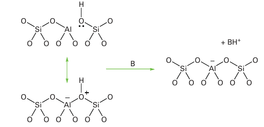 Figure 26.24 The Brønsted acid site in H-ZSM5 and its interaction with a base, typically an organic molecule. (Based on W.O. Haag, R.M. Lago, and P.B. Weisz, Nature, 1984, 309, 589.)