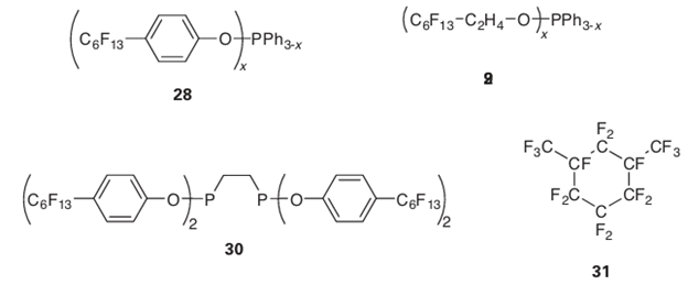 retained in the fluorous solvent, with the reactants (and products) preferentially soluble in the hydrocarbon phase. Figure 26.29 indicates the type of sequence that is used. Separation of the products from the catalyst becomes a trivial matter of decanting one liquid from another. A number of ligand systems that confer fluorous solubility on a catalyst have been developed; typically, they are phosphine based such as (28), (29), and (30). Rhodium- and Pd-based catalysts of these ligands have then been prepared. With a fluorous solvent such as perfluoro-1,3-dimethylcyclohexane (31), miscibility with an organic phase can be achieved at 70ºC, and catalysts have been used in hydrogenation (Section 26.4), hydroformylation (Section 26.5), and hydroboration reactions.