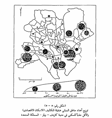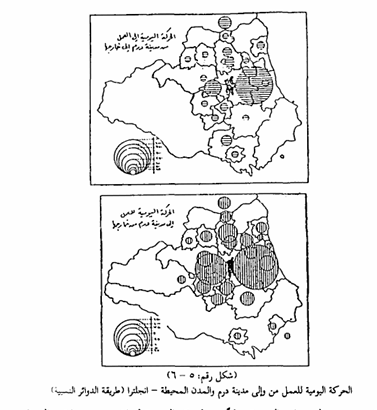 وإذا فصلنا الحركة داخلة in-commuters وخارجة out-commuters فإنه يمكن تمثيلها على الخريطة بطريقة الدوائر النسبية والخريطتين في الشكل رقم (5 - 6) وكلاهما يمثل عدد الرحلات اليومية الداخلة والخارجة من مدينة درم - انجلترا، تضيفان مثالاً آخر من مظاهر التمثيل الكارتوجرافي بهذه الطريقة التي يشيع استخدامها لتمثيل عدد كبير من الظاهرات العمرانية على الخرائط المختلفة ، وقد تستخدم المربعات النسبية بدلاً من الدوائر النسبية لبيان توزيع رحلات العمل اليومية الداخلة أو الخارجة من المدينة.