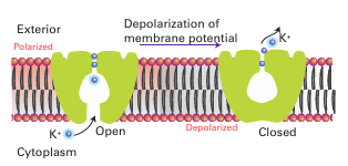 Figure 27.6 Proposed mechanism of action of the K channel. The potential difference across the membrane is sensed by the protein, which causes the pore to open, allowing hydrated ions to enter the cavity. After shedding their hydration sphere, K ions pass up the selectivity filter at rates close to diffusion control.