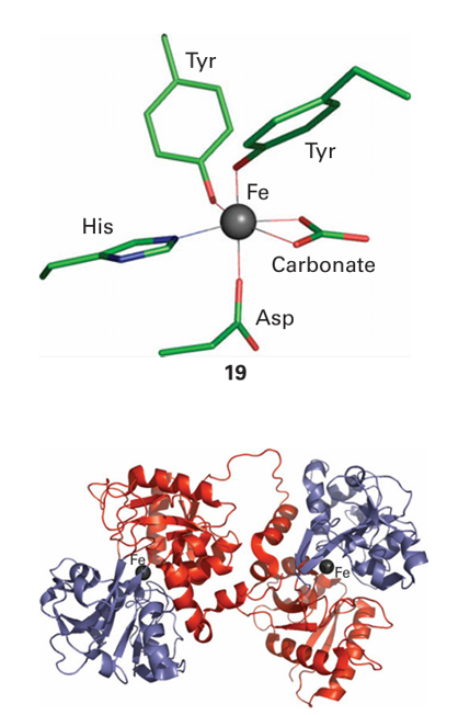 where TF denotes transferrin. For each site, the association constant under physiological conditions (pH=7) is in the range 1022–1026. However, its value depends strongly on the pH and this dependence is the main factor controlling Fe uptake and release. Transferrin consists of two very similar parts, termed the N-lobe and the C-lobe (Fig. 27.12). The protein is a product of gene duplication because the structure of the first half of the molecule can almost be overlaid on the second half. Each half consists of two domains, 1 and 2, which together form a cleft with a binding site for Fe (III). There is a considerable proportion of α helix, resulting in flexibility. Complexation with Fe (III) causes a conformational change consisting of a hinge motion involving domains 1 and 2 at each lobe. Binding of Fe (III) causes the domains to come together. In each active site (19), a single Fe atom is coordinated by widely dispersed amino acid side chains from both domains and the connecting region, hence the change in conformation that occurs. The protein ligands are carboxylate-O (Asp), two phenolate-O (Tyr), and an imidazole-N (His). Only one of the aspartate carboxylate-O atoms is coordinated. The protein ligands form part of a distorted octahedral coordination sphere. The coordination is completed by bidentate binding to the exogenous carbonate, which is referred to as a synergistic ligand because Fe binding depends on its presence. In certain cases phosphate is bound instead of carbonate. As expected from the predominantly anionic ligand set, Fe (III) binds much more tightly than Fe (II). However, ions similar to Fe (III), particularly Ga (III) and Al(III), also bind tightly, so that these metals can use the same transport system to gain access to tissues.
