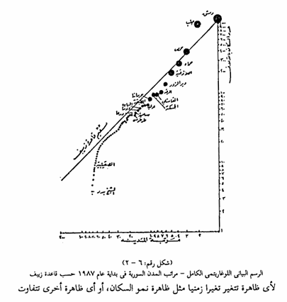 ويستخدم لرسم الخطوط البيانية اللوغاريتمية ورق رسم بیاني خاص يسمى باللوحات اللوغاريتمية وعند تنفيذ هذه الخطوط نقوم بوضع رسم أي سلسلة القيم أمام التقسيمات المحددة على المحور مادامت تتناسب مع هذه التقسيمات وفق لدورات اللوغاريتمية المتماثلة في المساحة التي تشغلها على لوحة الرسم. وهناك نمطين من أنماط التمثيل البياني اللوغاريتمي أحدهما يعرف بالنمط اللوغاريتمي الكامل والآخر يطلق عليه اسم النمط نصف اللوغاريتمي وفي النمط اللوغاريتمي الكامل يقسم كل من المحورين الأفقي والرأسي تقسيما لوغاريتميا وذلك عندما نريد دراسة العلاقة بين لوغاريتمات قيم المتغير الأول ولوغاريتمات قيم المتغير الثاني وبصفة عامة هناك لوحات جاهزة من الورق اللوغاريتمي تغنينا عن استخدام لوغاريتمات المتغيرات المختلفة عندما نزيد توضيح التوزيع النسبي لقيم هذه المتغيرات، كما تعفينا من الوقت والجهد الذي يستغرق في انشاء مثل هذه اللحات، إذ تقوم هذه اللوحات المقسمة لوغاريتميا مقام الجداول وتعطى مباشرة النتائج المطلوبة ومن خيراً أمثلة هذا النوع من الرسوم البيانية ذلك الذي تستخدم لتوضيح مراتب المدن حسب عدد سكان المدينة ورتبتها أما النمط نصف اللوغاريتمي فهو لا يختلف كثيرا عن النمط السابق إلا في أن أحد المحورين لا يقسم تقسيما لوغاريتميا بل يقسم تقسيما حسابيا، وعادة يكون التقسيم اللوغاريتمي على المحور الرأسي فقط ويسود استخدام النمط نصف اللوغاريتمى عندما يراد تمثيل بعض معدلات النمو الرسم البياني اللوغاريتمي الكامل مراتب المدن السورية في بداية عام 1987 حسب قاعدة زييف لأي ظاهرة تتغير تغيرا زمنيا مثل ظاهرة نمو السكان، أو أي ظاهرة أخرى تتفاوت في خصائصها مثل تباين توزيع أحجام المدن فى مختلف الدول ففي حالة تمثيل أعداد السكان أمام سنوات التعدادات المختلفة على ورق الرسم البياني نصف اللوغاريتمي يمكن أن نقف على ما إذا كان نمو السكان فيما بين هذه التعدادات يتخذ معدلات ثابتا أو متزايدا أو متناقصا بمجرد النظر إلى الخط البياني على الرسم والذي إذا اتخذ شكل الخط المستقيم فإن ذلك يدل على أن السكان يتزايدون معدل ثابت ، أما في حالة استخدام هذا النمط من الرسم البياني النصف اللوغاريتمي لبيان توزيع أحجام المدن في بعض الدول مثلا، فإن الخط البياني الى الرسم إذا كان خطا مستقيما فإنه دل على التوزيع المعتدل الأحجام المدن في الدولة التي يمثلها هذا الخط ، كما يمكن أن نستخلص بعض الحقائق الهامة من الخطوط البيانية الى هذا الرسم والتي منها أن أعلى الخطوط يدل على زيادة نسبة إعداد المدن الصغيرة الحجم (كما في حالة دولة بليجيكا) ، وأن أشد الخطوط المستقيمة انحدارا (أو ميلا) يدل على صفر نسبة أعداد المدن الكبيرة الحجم كما في حالة دولة سويسرا.