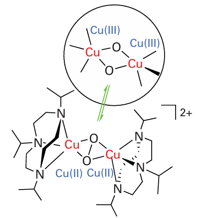 Simple Cu complexes that can coordinate O2 reversibly are also rare, but studies have revealed interesting chemistry that is particularly relevant for developing catalysts for oxygenation reactions. Analogues of the dinuclear Cu(I) centre of haemocyanin react with O2 but have a strong tendency to undergo further reactions that involve cleavage of the O-O bond, an example being the rapid equilibrium between µ-η2: η2 peroxo-dicopper (II) and bis(µ-oxo) copper (III) complexes shown in Fig. 27.20.