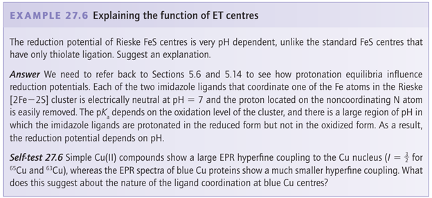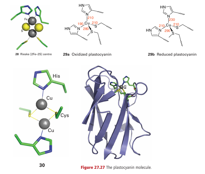 Key point: The protein overcomes the large inherent difference in preferred geometries for Cu (II) and Cu(I) by constraining Cu in a coordination environment that does not change upon electron transfer. The so-called ‘blue’ Cu centre is the active site of a number of small electron-transfer prteins as well as larger enzymes (the blue Cu oxidases) that contain, in addition, other Cu sites. Blue Cu centres have reduction potentials for the Cu (II)/Cu(I) redox couple that lie in the range 0.15 0.8 V and so they are generally more oxidizing than cytochromes. The name stems from the intense blue colour of pure samples in the oxidized state, which arises from ligand(thiolate)-to-metal charge transfer. In all cases, the Cu is shielded from solvent water and coordinated by a minimum of two imidazole-N and one cysteine-S in a nearly trigonal planar manner, with one or two longer bonds to axial ligands. The most studied examples are plastocyanin (Fig. 27.27), a small electron carrier protein in chloroplasts, and azurin, a bacterial electron carrier. These small proteins have a β-barrel structure, which holds the Cu coordination sphere in a rigid geometry. Indeed, the crystal structures of oxidized, reduced (29, numbers refer to bond distances in pm), and apo forms reveal that the ligands remain in essentially the same position in all cases. As a result, the blue Cu centre is well suited to undergo fast and efficient electron transfer because the reorganization energy is small. The dinuclear Cu centre known as CuA is present in cytochrome c oxidase and N2O re ductase. The two Cu atoms (30) are each coordinated by two imidazole groups and a pair of cysteine thiolate ligands act as bridging ligands. In the reduced form, both Cu atoms are Cu(I). This form undergoes one-electron oxidation to give a purple, paramagnetic species in which the unpaired electron is shared between the two Cu atoms. Once again, we see how delocalization assists electron transfer because the reorganization energy is lowered.