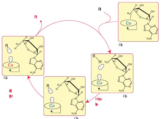 Radical-based rearrangements occur by a mechanism involving initiation of radical formation that begins with enzyme-induced weakening of the Co C (adenosine) bond. In the free state, the Co C bond dissociation energy is about 130 kJ mol 1, but when bound in the