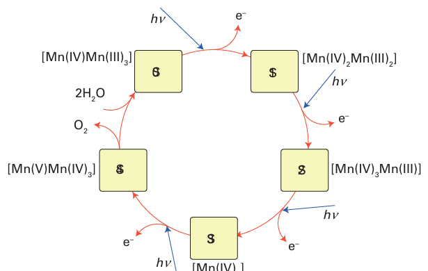 Figure 27.40 The S-cycle for evolution of O2 by successive one-electron oxidations of the [4MnCa 4O] cluster of photosystem II. The formal oxidation numbers of the Mn components are indicated, but H+ transfers are omitted. In chloroplasts that have become adapted to dark conditions, the cycle ‘rests’ in the S1 state.