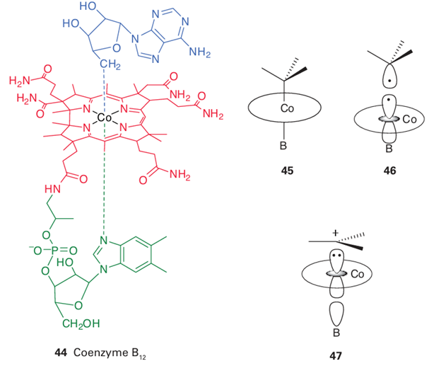 The Co atom can exist in three oxidation states under physiological conditions, Co (III), Co (II), and Co(I), all of which are low spin. The electronic structure of Co is crucial to its biological activity. As expected, the Co (III) form (d6) is an 18-electron, six-coordinate species (45). The Co (II) form (46) is 17-electron, five-coordinate and has its unpaired electron in the dz2 orbital. These species are termed ‘base-on’ forms because the fifth nitrogen ligand is coordinated. The Co(I) form (47) is a classic 16-electron, four-coordinate square planar species, due to dissociation of both axial ligands. The square-planar structure is a ‘base-off’ form.