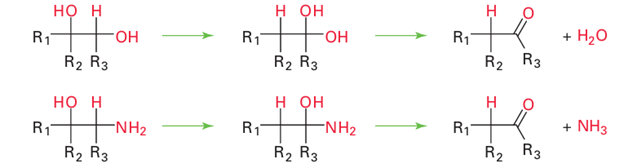 Dehydration and deamination occur after two -OH or -OH and -NH2 become placed on the same carbon atom and hence are triggered by isomerization: