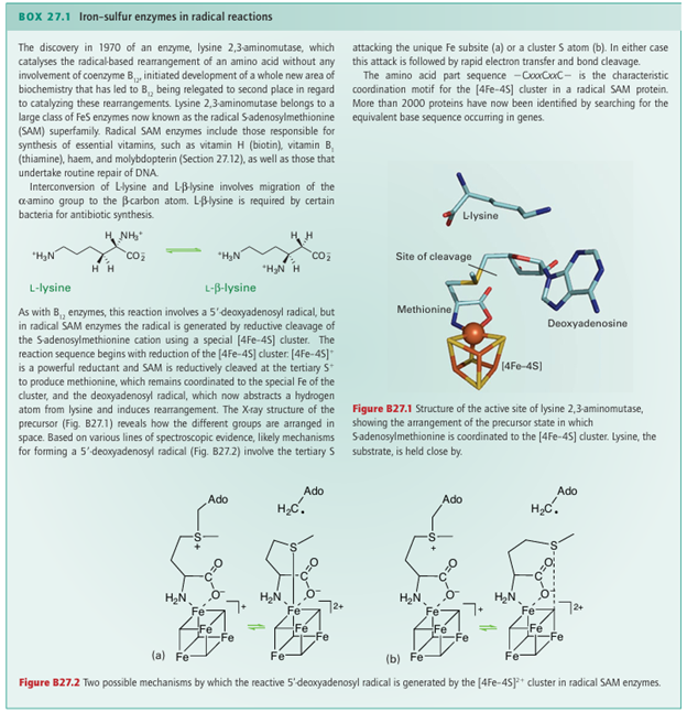 enzyme the bond is substantially weakened, resulting in homolytic cleavage of the Co-CH2R bond. This step results in five-coordinate low-spin Co (II) and a CH2 R radical, which gives rise to controlled radical chemistry in the enzyme active site pocket (Fig. 27.42). Important examples are methylmalonyl CoA mutase and diol dehydratases. In 1970, an alternative system for catalyzing radical-based rearrangements was discovered that does not depend on Co. As described in Box 27.1, the enzymes involved use instead a [4Fe-4S] cluster to generate the active deoxyadenosyl radical by reductive cleavage of its methionyl derivative.