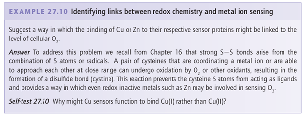 Key point: Cu and Zn are sensed by proteins with binding sites specially tailored to meet the specific coordination preferences of each metal atom. The levels of Cu in cells are so strictly controlled that almost no uncomplexed Cu is present. An imbalance in Cu levels is associated with serious health problems such as Menkes disease (Cu deficiency) and Wilson’s disease (Cu accumulation). Most of what we know about how Cu levels are sensed and converted to cell signals stems from studies on the E. coli system, which involves a transcription factor called CueR (Fig. 27.53). This protein binds Cu(I) with high selectivity, although it also binds Ag(I) and Au(I). Metal coordination causes a conformational change that enables CueR to bind to DNA at a receptor site that controls transcription of an enzyme known as CopA, which is an ATP-driven Cu pump. CopA is located in the cytoplasmic membrane and exports Cu into the periplasm. In CueR, the Cu(I) is coordinated by two cysteine-S atoms arranged in a linear coordination geometry. Titrations using CN as a buffer show that Cu is bound with a dissociation constant of approximately 10 21. As may be understood by reference to Section 7.3, this ligand environment leads to remarkably selective binding for d10 ions, and measurements with Ag and Au show that these ions are taken up with similar affinities. Most of our current insight about Zn sensing, as for Cu, is provided by studies of bacterial systems. The major difference with respect to Cu is that although Zn is also coordinated (mainly) by cysteine thiolates, the geometry is tetrahedral rather than linear. E. coli contains a Zn2-sensing transcription factor known as ZntR that is closely related to CueR. The factor ZntR contains two Zn-binding domains each of which coordinates a pair of Zns using cysteine and histidine ligands. The surrounding protein fold is shown in Fig. 27.53, for comparison with CueR. The extent to which these dynamic Zn-binding sites can be identified with zinc fingers remains unclear.