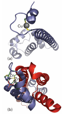 Figure 27.53 Comparison of (a) the Cu- and (b) the Zn-binding sites in the respective transcription factors CueR and ZntR. Note how Cu(I) is recognized by a linear binding site (to two cysteines) whereas Zn is recognized by an arrangement of Cys and His ligands that binds two Zn (II) atoms together with a bridging phosphate group.