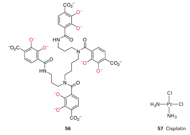 Key points: The complex cis-[PtCl2(NH3)2] results in the inhibition of DNA replication and prevention of cell division; other drugs cause DNA to be degraded by oxygenation. ‘Cancer’ is a term that covers a large number of different types of the disease, all characterized by the uncontrolled replication of transformed cells that overwhelm the normal operation of the body. The principle of treatment is to apply drugs that destroy these malignant cells selectively. The remarkable action of the complex cis- [PtCl2 (NH3 )2] (57, known as cisplatin) was discovered in 1964 while examining the effect of an electric field on the growth of bacteria. The behaviour of a colony of bacteria suspended in solution between two platinum electrodes was observed, and it was noted that the cells continued to grow in size, forming long filaments, but stopped replicating. The effect was traced to a complex that was