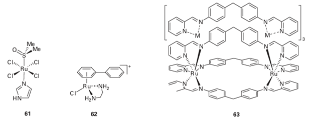 Despite its efficacy, cisplatin has highly undesirable side effects, in particular it causes serious damage to the kidneys before it is eventually excreted. Great efforts have been made to find Pt complexes that are effective with fewer side effects. One example in clinical use is carboplatin (58). Effective drugs may also include trinuclear Pt(II) (59) as well as Pt(IV) complexes such as satraplatin (60), which can be administered orally. Other metal complexes are being discovered that bind by intercalation within the DNA interior and offer improved efficacy over Pt drugs. They include Ru(III) complexes such as fac-[RuCl3 (NH3 )3 ], which are believed to function by providing a source of Ru(III) that is carried to cancer cells by transferrin, and the complex (61), which may be activated by reduction to Ru(II) in vivo. There is increasing interest in organometallic compounds. The Ru(II) arene complex (62), which possesses high anti-cancer activity, is believed to coordinate to guanine-N in a similar way to Pt complexes but the interaction is supplement ed by intercalation of the biphenyl group within the hydrophobic DNA core as well as hydrogen bonding between guanine and the NH2 groups of the en ligand. Even common Ti compounds such as TiCp2Cl2 have undergone clinical trials. Metallo-supramolecular ‘cylinders’ formed by placing a metal cation at either end of a bundle of ligands (63) have much larger dimensions that mimic those of Zn fingers. The cylinders bind in the major groove of DNA, causing it to form small coils.