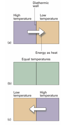 Fig. 1.2 Energy flows as heat from a region at a higher temperature to one at a lower temperature if the two are in contact through a diathermic wall, as in (a) and (c). However, if the two regions have identical temperatures, there is no net transfer of energy as heat even though the two regions are separated by a diathermic wall (b). The latter condition corresponds to the two regions being at thermal equilibrium.