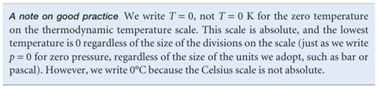 The Zeroth Law justifies the concept of temperature and the use of a thermometer, a device for measuring the temperature. Thus, suppose that B is a glass capillary containing a liquid, such as mercury, that expands significantly as the temperature increases. Then, when A is in contact with B, the mercury column in the latter has a certain length. According to the Zeroth Law, if the mercury column in B has the same length when it is placed in thermal contact with another object C, then we can predict that no change of state of A and C will occur when they are in thermal contact. More-over, we can use the length of the mercury column as a measure of the temperatures of A and C. In the early days of thermometry (and still in laboratory practice today), tempera tures were related to the length of a column of liquid, and the difference in lengths shown when the thermometer was first in contact with melting ice and then with boiling water was divided into 100 steps called ‘degrees’, the lower point being labelled 0. This procedure led to the Celsius scale of temperature. In this text, temperatures on the Celsius scale are denoted θ and expressed in degrees Celsius (°C). However, because different liquids expand to different extents, and do not always expand uniformly over a given range, thermometers constructed from different materials showed different numerical values of the temperature between their fixed points. The pressure of a gas, however, can be used to construct a perfect-gas temperature scale that is independent of the identity of the gas. The perfect-gas scale turns out to be identical to the thermodynamic temperature scale to be introduced in Section 3.2c, so we shall use the latter term from now on to avoid a proliferation of names. On the thermodynamic temperature scale, temperatures are denoted T and are normally reported in kelvins, K (not °K). Thermodynamic and Celsius temperatures are related by the exact expression