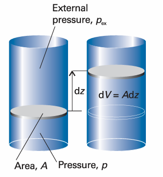 Fig. 2.6 When a piston of area A moves out through a distance dz, it sweeps out a volume dV = Adz. The external pressure pex is equivalent to a weight pressing on the piston, and the force opposing expansion is F=pexA.