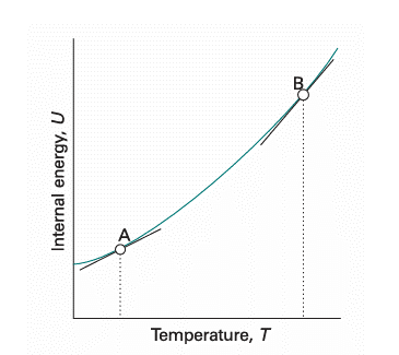 Fig. 2.10 The internal energy of a system increases as the temperature is raised; this graph shows its variation as the system is heated at constant volume. The slope of the tangent to the curve at any temperature is the heat capacity at constant volume at that temperature. Note that, for the system illustrated, the heat capacity is greater at B than at A.