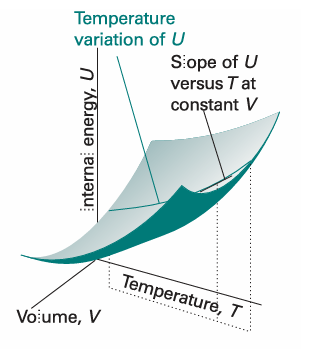 Fig. 2.11 The internal energy of a system varies with volume and temperature, perhaps as shown here by the surface. The variation of the internal energy with temperature at one particular constant volume is illustrated by the curve drawn parallel to T. The slope of this curve at any point is the partial derivative (∂U/∂T)V.