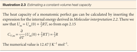 Heat capacities are extensive properties: 100 g of water, for instance, has 100 times the heat capacity of 1 g of water (and therefore requires 100 times the energy as heat to bring about the same rise in temperature). The molar heat capacity at constant volume, CV, m = CV/n, is the heat capacity per mole of material, and is an intensive property (all molar quantities are intensive). Typical values of CV, m for polyatomic gases are close to 25 J K−1 mol−1. For certain applications it is useful to know the specific heat capacity (more informally, the ‘specific heat’) of a substance, which is the heat capacity of the sample divided by the mass, usually in grams: CV, s = CV/m. The specific heat capacity of water at room temperature is close to 4 J K−1 g−1. In general, heat capacities depend on the temperature and decrease at low temperatures. However, over small ranges of temperature at and above room temperature, the variation is quite small and for approximate calculations heat capacities can be treated as almost independent of temperature. The heat capacity is used to relate a change in internal energy to a change in temperature of a constant-volume system. It follows from eqn 2.15 that , dU=CVdT (at constant volume) , That is, at constant volume, an infinitesimal change in temperature brings about an infinitesimal change in internal energy, and the constant of proportionality is CV. If the heat capacity is independent of temperature over the range of temperatures of interest, a measurable change of temperature, ∆T, brings about a measurable increase in internal energy, ∆U, where , ∆U=CV∆T (at constant volume) , Because a change in internal energy can be identified with the heat supplied at constant volume (eqn 2.13b), the last equation can be written , qV =CV∆T , This relation provides a simple way of measuring the heat capacity of a sample: a measured quantity of energy is transferred as heat to the sample (electrically, for example), and the resulting increase in temperature is monitored. The ratio of the energy trans ferred as heat to the temperature rise it causes (qV/∆T) is the constant-volume heat capacity of the sample. , A large heat capacity implies that, for a given quantity of energy transferred as heat, there will be only a small increase in temperature (the sample has a large capacity for heat). An infinite heat capacity implies that there will be no increase in temperature however much energy is supplied as heat. At a phase transition, such as at the boiling point of water, the temperature of a substance does not rise as energy is supplied as heat: the energy is used to drive the endothermic transition, in this case to vaporize the water, rather than to increase its temperature. Therefore, at the temperature of a phase transition, the heat capacity of a sample is infinite. The properties of heat capacities close to phase transitions are treated more fully in Section 4.7.
