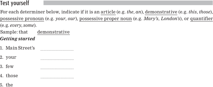 There are words, such as every and several, that indicate amount, or quantity, and these are called quantifiers. Quantifiers can act as determiners; that is, they can come before and introduce a noun. The determiners are underlined in the following sentences:
