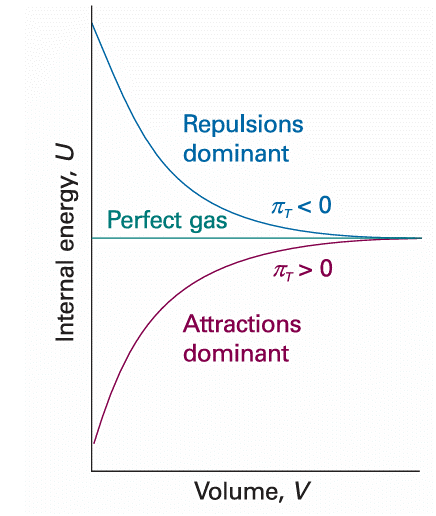 Fig. 2.25 For a perfect gas, the internal energy is independent of the volume (at constant temperature). If attractions are dominant in a real gas, the internal energy increases with volume because the molecules become farther apart on average. If repulsions are dominant, the internal energy decreases as the gas expands.