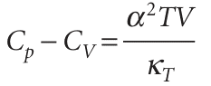 Equation 2.49 applies to any substance (that is, it is ‘universally true’). It reduces to eqn 2.48 for a perfect gas when we set α=1/T and κT=1/p. Because expansion coefficientsαof liquids and solids are small, it is tempting to deduce from eqn 2.49 that for them Cp≈CV. But this is not always so, because the compressibility κT might also be small, so α2/κT might be large. That is, although only a little work need be done to push back the atmosphere, a great deal of work may have to be done to pull atoms apart from one another as the solid expands. As an illustration, for water at 25°C, eqn 2.49 gives Cp,m=75.3 J K−1mol−1compared with CV,m=74.8 J K−1mol−1. In some cases, the two heat capacities differ by as much as 30 per cent.