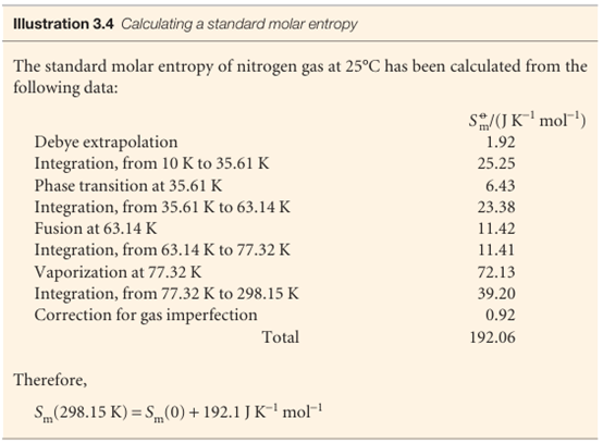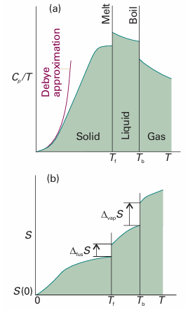 The entropy of a system at a temperature T is related to its entropy at T = 0 by measuring its heat capacity Cp at different temperatures and evaluating the integral in eqn 3.18, taking care to add the entropy of transition (∆trsH/Ttrs) for each phase transition between T =0 and the temperature of interest. For example, if a substance melts at Tf and boils at Tb, then its entropy above its boiling temperature is given by