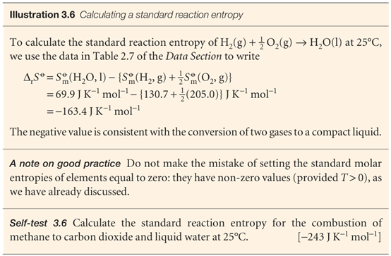 Entropies reported on the basis that S (0) =0 are called Third-Law entropies (and often just ‘entropies’). When the substance is in its standard state at the temperature T, the standard (Third-Law) entropy is denoted So(T). A list of values at 298 K is given in Table 3.3. The standard reaction entropy, ∆rSo, is defined, like the standard reaction en thalpy, as the difference between the molar entropies of the pure, separated products and the pure, separated reactants, all substances being in their standard states at the specified temperature: