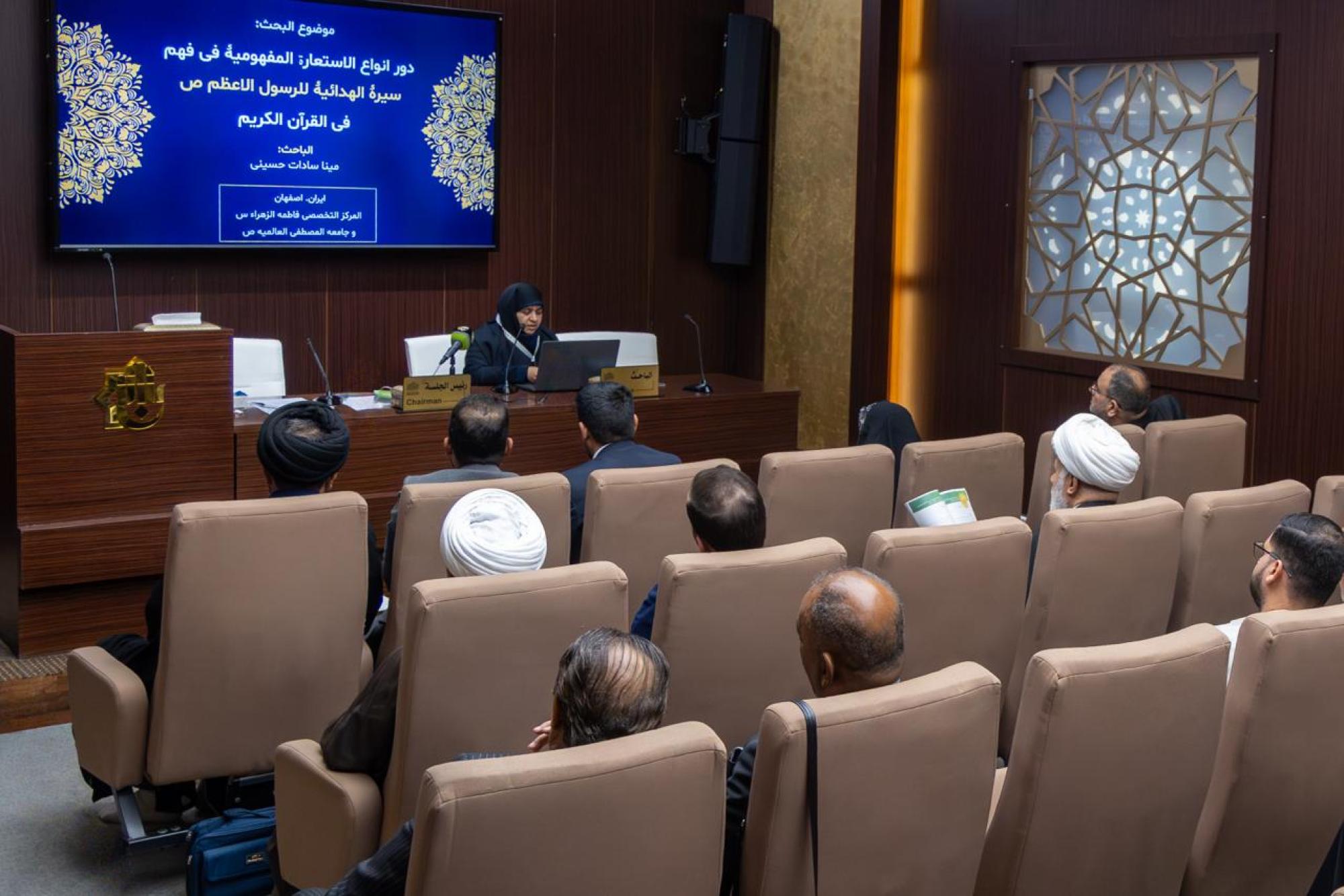 قدمت الباحثة من دولة إيران الدكتورة مينا سادات حسيني دراسة بحثية بعنوان (دور أنواع الاستعارة المفهومية في فهم السيرة الهدايتية للرسول الأعظم -صلى الله عليه وآله- في القرآن الكريم) ضمن فعّاليات مؤتمر دار الرسول الأعظم (صلّى الله عليه وآله) العلميّ الدوليّ الرابع. ويُعقد المؤتمرُ الذي تنظّمُه الدارُ التابعة لقسم الشؤون الفكرية والثقافية في العتبة العبّاسية المقدّسة، وكلّية التربية الأساسية للبنات/ جامعة العميد، تحت عنوان (السيرة النبويّة المباركة بين الثوابت القرآنيّة ومتغيّرات المناهج العلميّة)، وتستمرّ فعَّالياتُه لمدّة يومَين. وذكرت حسيني في ملخص بحثها أنّ "علم الدلالة المعرفي يُعدّ من فروع العلوم المعرفية ومن تخصصات اللسانيات المعرفية، الذي يبحث في كيفية التصور المفهومي من خلال مبادئ أساسية كالاستعارة المفهومية، إذ يساعد هذا المنهج في تفسير الكيفية التي نفهم بها المفاهيم المجردة (المجال المقصدي) على وَفقِ المفاهيم الحسية (المجال المصدري)." وأضافت "يفتح تحليل أنواع الاستعارة في القرآن، لا سيّما في قضايا دينية مثل سيرة النبي الهدايتية، آفاقًا عميقة في المعرفة، ويساعد في تكوين رؤية كونية صحيحة وفهم أوضح". وأوضحت "يعتمد هذا البحث المتعدد التخصصات بين العلوم المعرفية ودراسات القرآن الكريم على المنهج التحليلي الوصفي، ويقوم بتحليل الآيات القرآنية المتعلقة بالنبي (صلى الله عليه وآله) لإعادة كشف المنهج القرآني في تغيير التفكير والسلوك البشري تجاه النبي، وهو منهج لم يول إليه اهتمام كافٍ". ويساعد في تمييز الآراء التفسيرية القوية من الضعيفة، إذ إنّ التركيز على الاستعارة المفهومية يزيل مجال الشك والتأويل والتقدير غير المبرر في تفسير الآيات في الاستعارات الجهتية (النبي على الصراط المستقيم) و(النبي على خلق عظيم). وتابعت "تتجلى أوجه التشابه المعرفية مثل السلطة والقدرة في الهداية القطعية، والعصمة من الزيغ، والمقام العالي والمجهول، والسلطة على الأخلاق، والتجلي الفائق للفضائل الأخلاقية في الاستعارة الوعائية (الظرفية) (رسول الله إناء القدوة الحسنة)، يتضمّن المجال المفهومي كون النبي قدوة شاملة وذاتية في الهداية، وفي الاستعارة المادية (النبي سراج منير)، يتم تصوير أصالته في الإنارة والهداية والحياة والنمو والسلام والحركة".