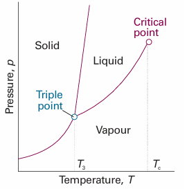 The phase diagram of a substance shows the regions of pressure and temperature at which its various phases are thermodynamically stable (Fig. 4.1). The lines separating the regions, which are called phase boundaries, show the values of p and T at which two phases coexist in equilibrium. Consider a liquid sample of a pure substance in a closed vessel. The pressure of a vapour in equilibrium with the liquid is called the vapour pressure of the substance (Fig. 4.2). Therefore, the liquid–vapour phase boundary in a phase diagram shows how the vapour pressure of the liquid varies with temperature. Similarly, the solid vapour phase boundary shows the temperature variation of the sublimation vapour pressure, the vapour pressure of the solid phase. The vapour pressure of a substance increases with temperature because at higher temperatures more molecules have sufficient energy to escape from their neighbours.